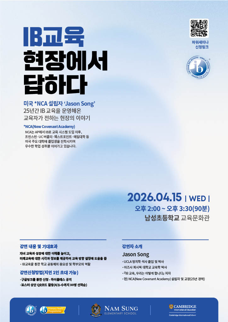 남성초등학교의 다양한 공식 발행물과 홍보자료를 한눈에 모아볼 수 있는 공간입니다. 학교 홍보영상, 브로슈어, 행사 포스터 등은 학생·학부모·동문 모두가 함께 공유하는 남성의 기록이자 이야기입니다. 연중 진행되는 학술 세미나, 올림픽, 나눔페어 등 교내 주요 행사와 더불어, 남성초등학교가 걸어온 발자취와 앞으로의 비전을 담은 자료들을 만나보세요.